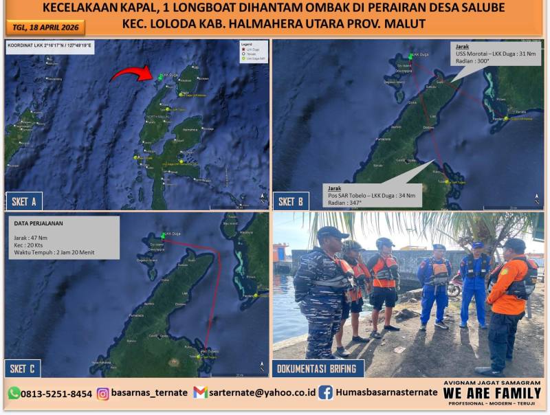 Kepala Seksi Operasi Dan Siaga Kantor SAR Ternate, Ferdinando Jofandri mengatakan, setelah mendapat laporan kejadian tersebut dari Kepala Desa Salube, pukul 08.30 Tim Rescue Pos SAR Tobelo bersama potensi SAR bergerak menuju LKP duga dengan menggunakan RIB 03 Tobelo untuk melaksanakan pencarian korban. (HM55)
